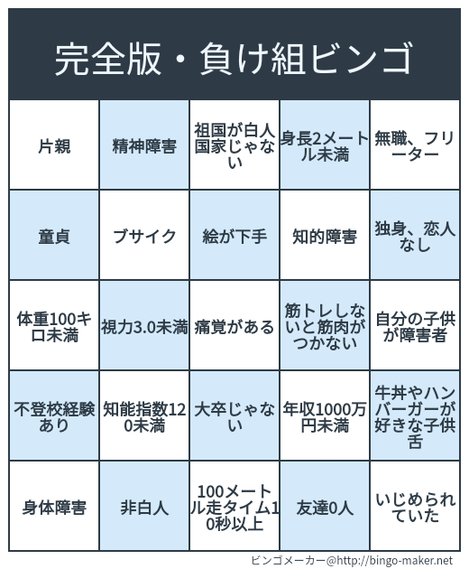 【悲報】チー牛「青春ビンゴ許さん!」ワイ「ならこの『負け組ビンゴ』はどうや?w」ドンッ