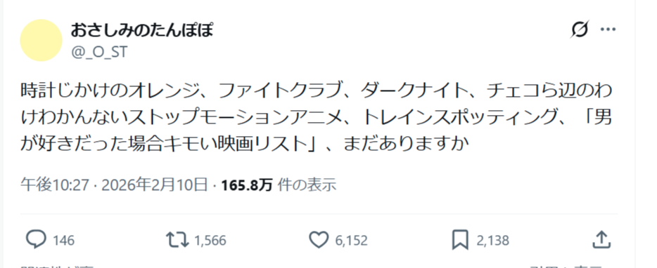 【悲報】「男が好きだとキモい映画リスト」、Xで話題になるwwww