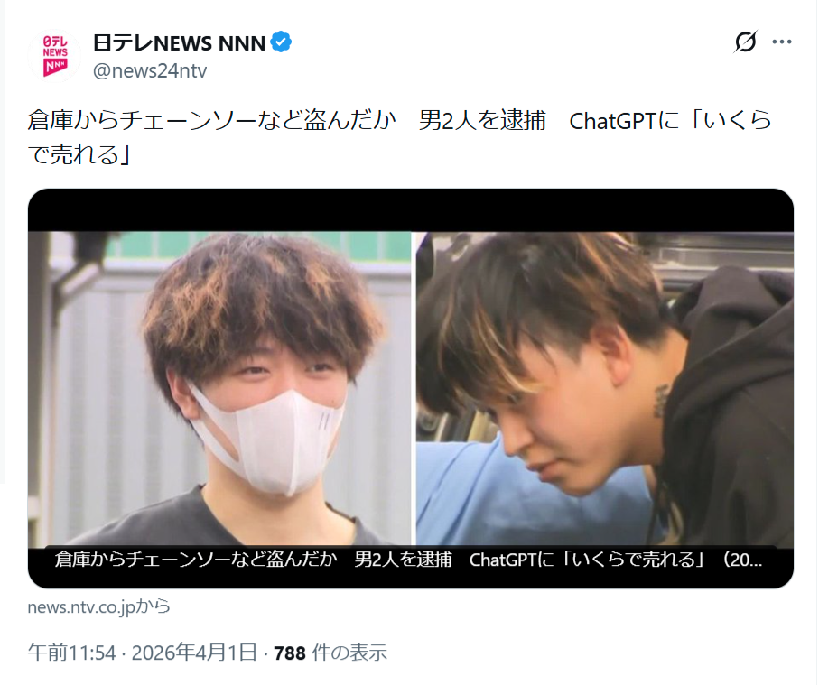 【悲報】窃盗犯、盗品をChatGPTに「いくらで売れる?」と聞いてしまうwwww