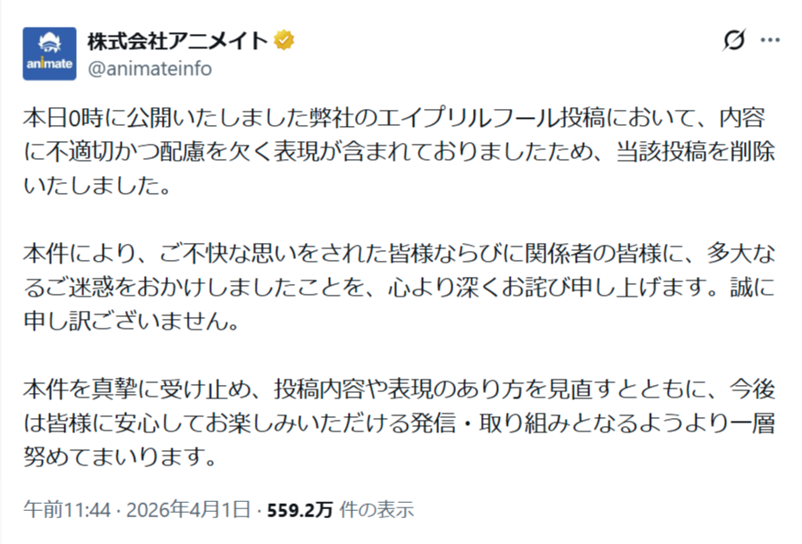 【悲報】アニメイト、エイプリルフール投稿で炎上→謝罪するwwww