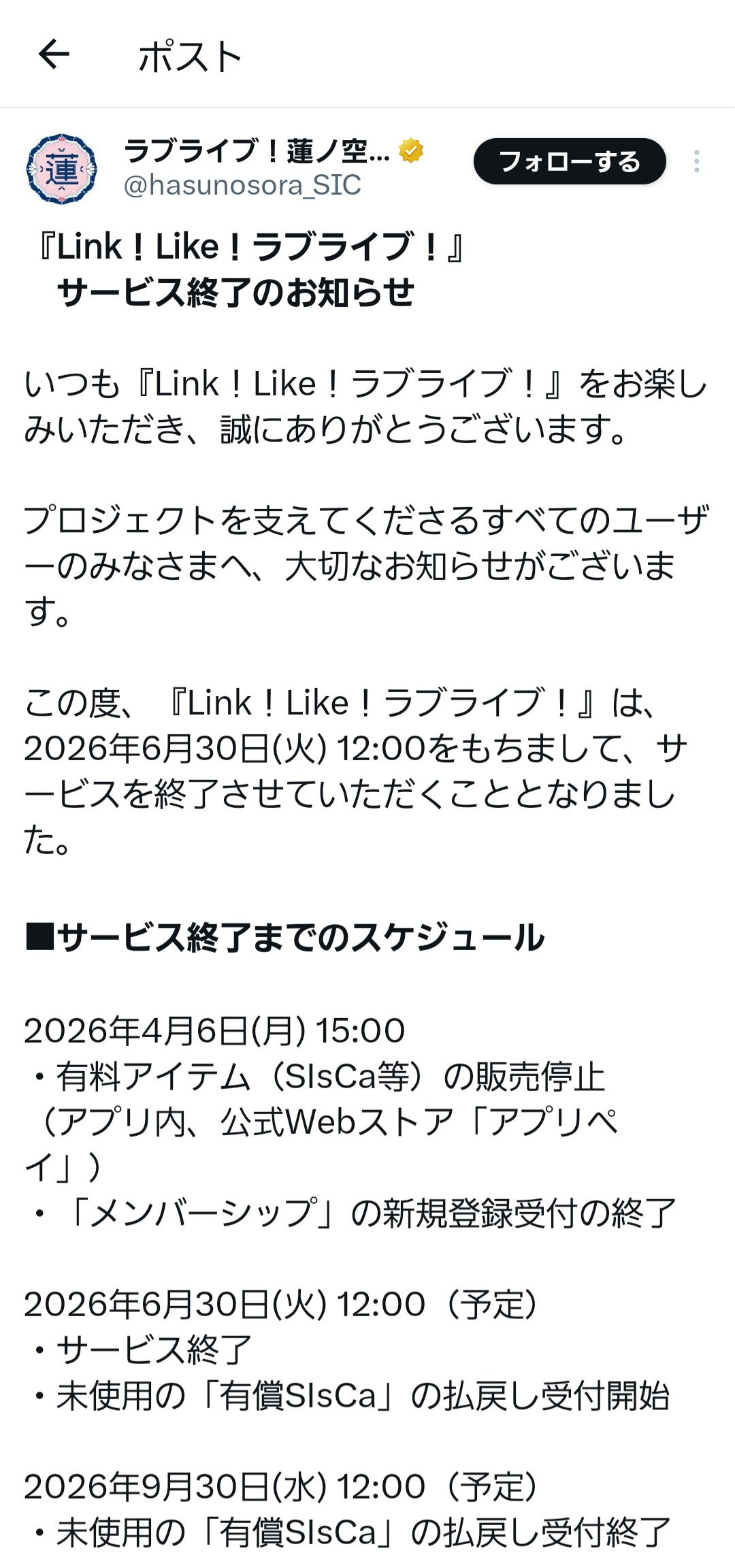 【悲報】『Link!Like!ラブライブ!』、6月30日でサービス終了
