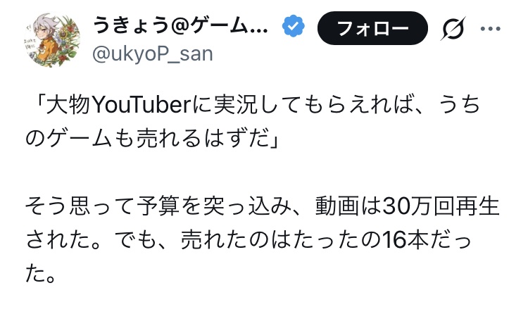 【悲報】ゲームプロデューサー「大物YouTuberにゲーム実況してもらい30万再生出たのにゲームは16本しか売れなかった」