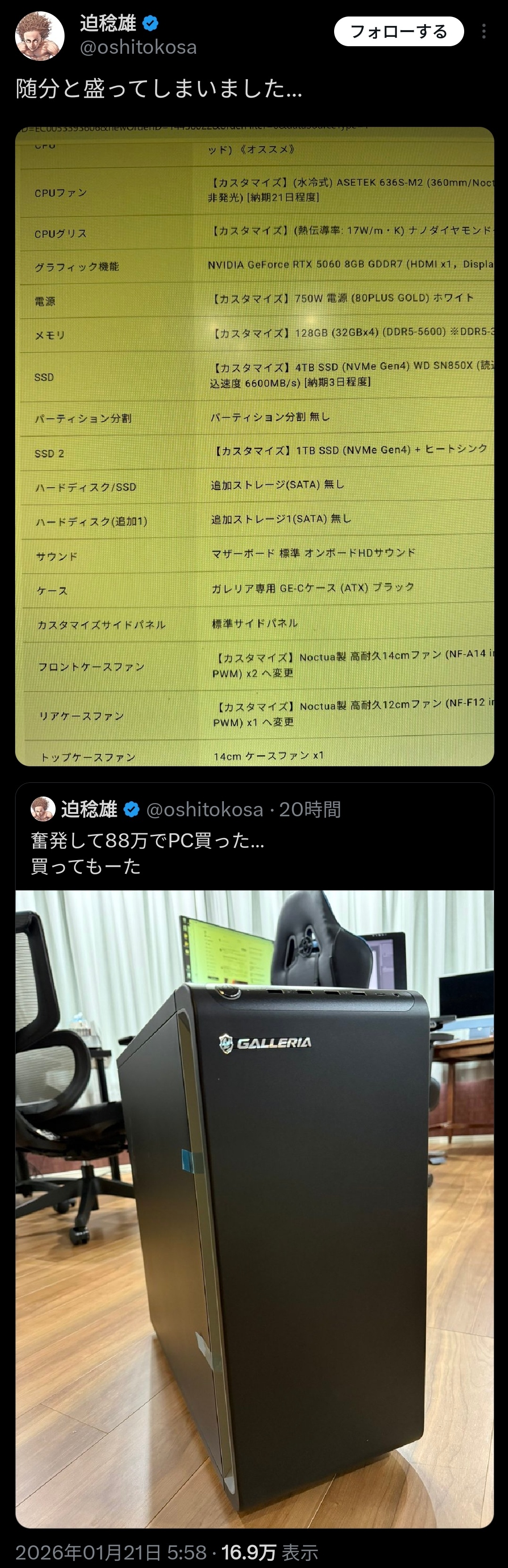 【画像】有名漫画家さん、88万円の高級パソコンを購入。スペックがこちらwwww