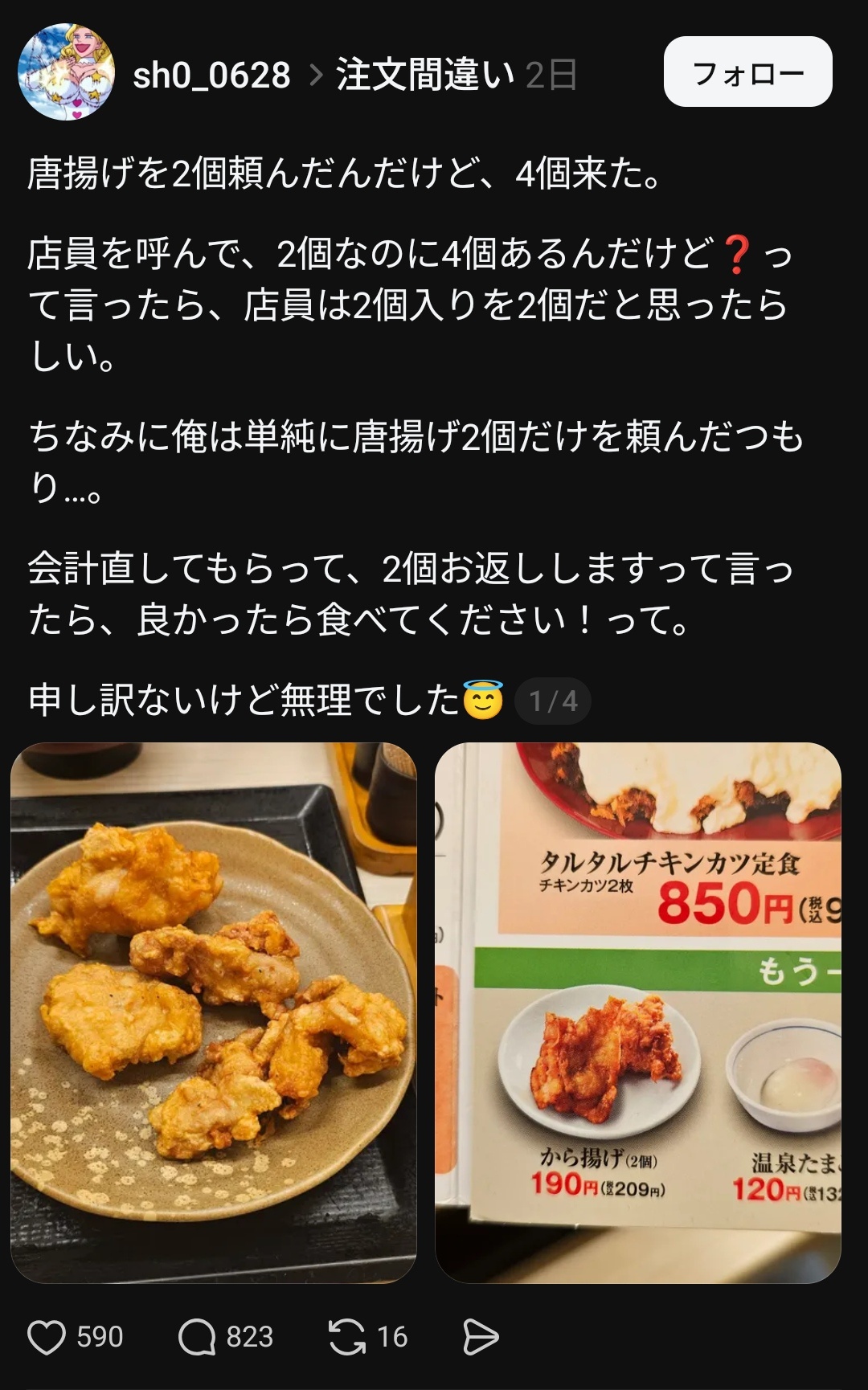 【悲報】おじ「唐揚げ2個頼んだら4個持ってきた」←これどっちが悪いの??