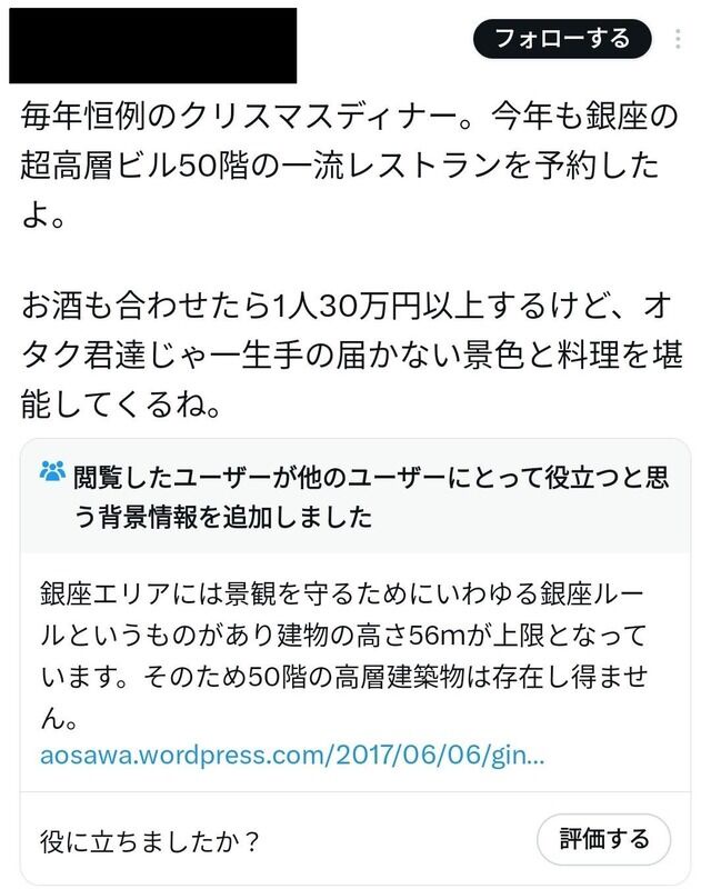 【悲報】嘘松女子「50階で30万のディナー。オタクは一生味わえないだろうねw」→結果wwww