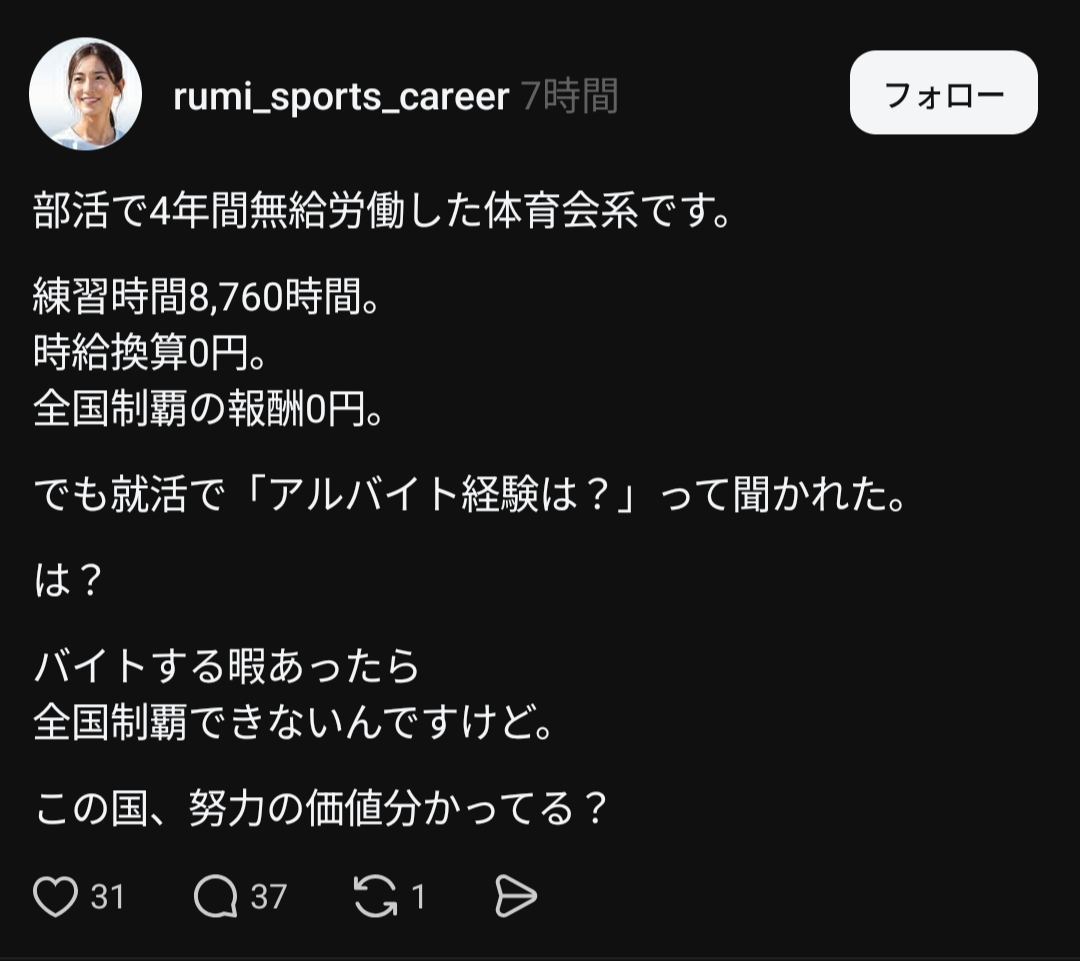 【悲報】体育会系女子「全国制覇しました」社会「うんで?バイト経験は?」
