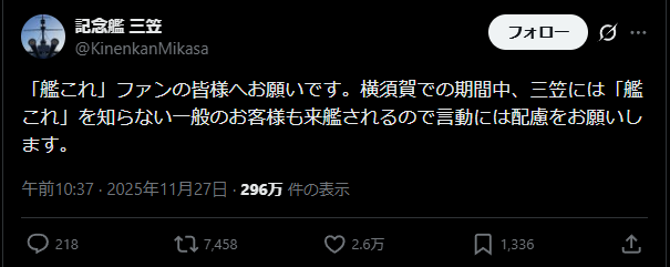 【悲報】記念館三笠公式「艦これの提督さん、三笠を見に来た一般人もいるので言動には配慮をお願いします」
