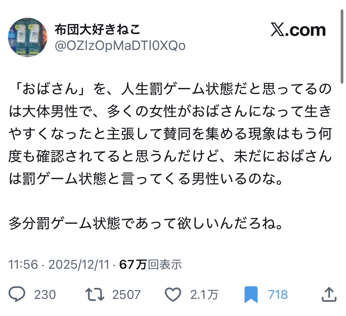 【悲報】女さん「おばさんを人生罰ゲーム状態だと思ってるのは大体男性。多くの女性がおばさんになって生きやすくなってる」