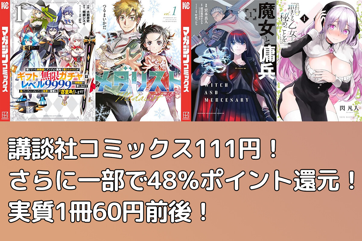 【講談社111円】Kindleで「無限ガチャ」「メダリスト」「魔女と傭兵」「聖なる乙女と秘めごとを」など注目マンガが111円均一&一部で48%還元も 【30冊】