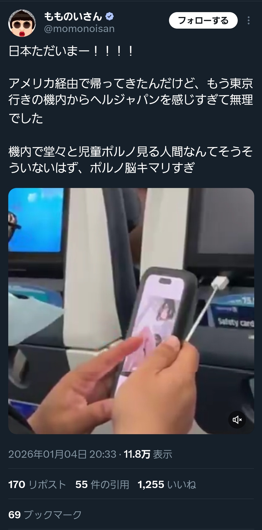 【悲報】飛行機内でアニメ画像を閲覧するおじさん、ガチのマジで存在していたwwww