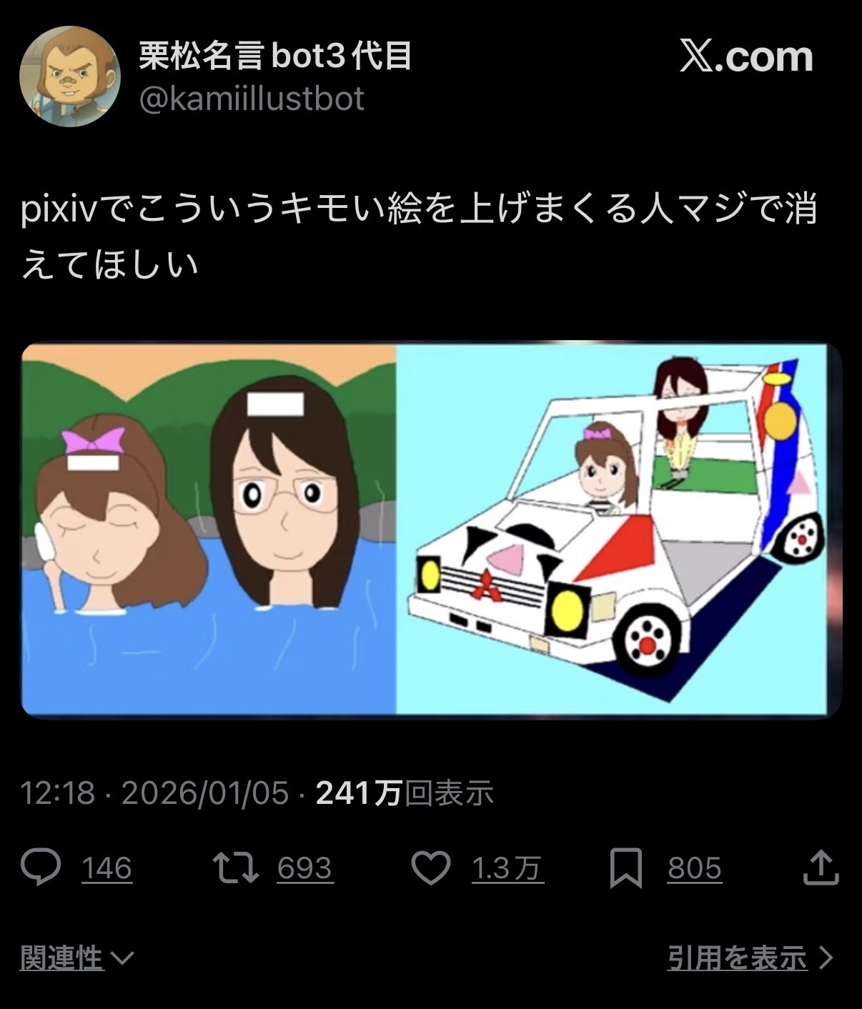 【悲報】アニメアイコン「pixivでこういうキモい絵を上げまくる人マジで消えてほしい」