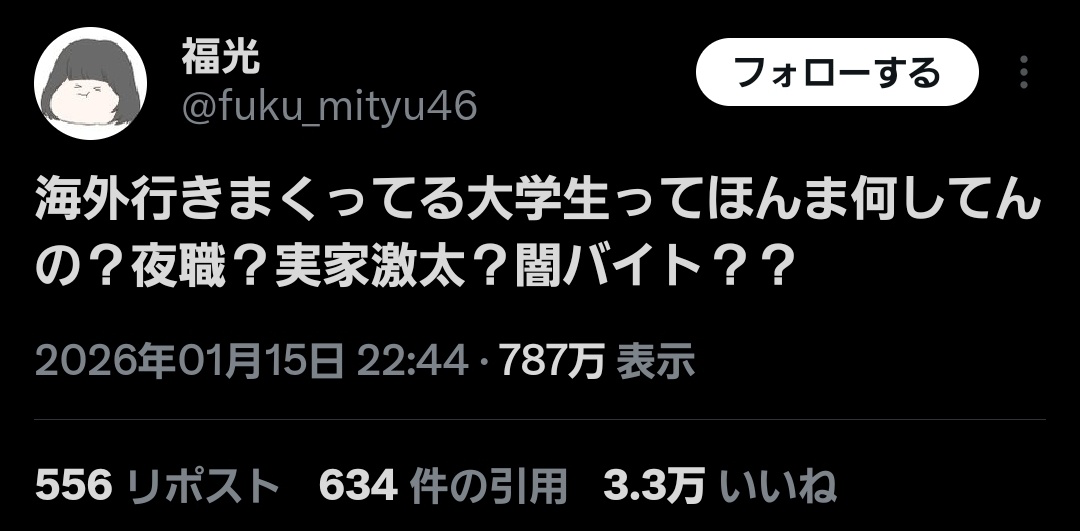 【謎】X民「海外行きまくってる大学生って何してんの?夜職?実家激太?」学生「頭の構造」