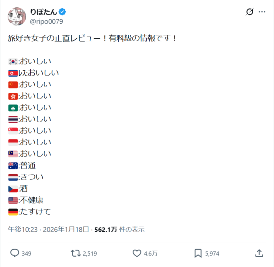 【画像】旅好き女子「飯がうめぇ国はここ!」←意外すぎる結果にwwww