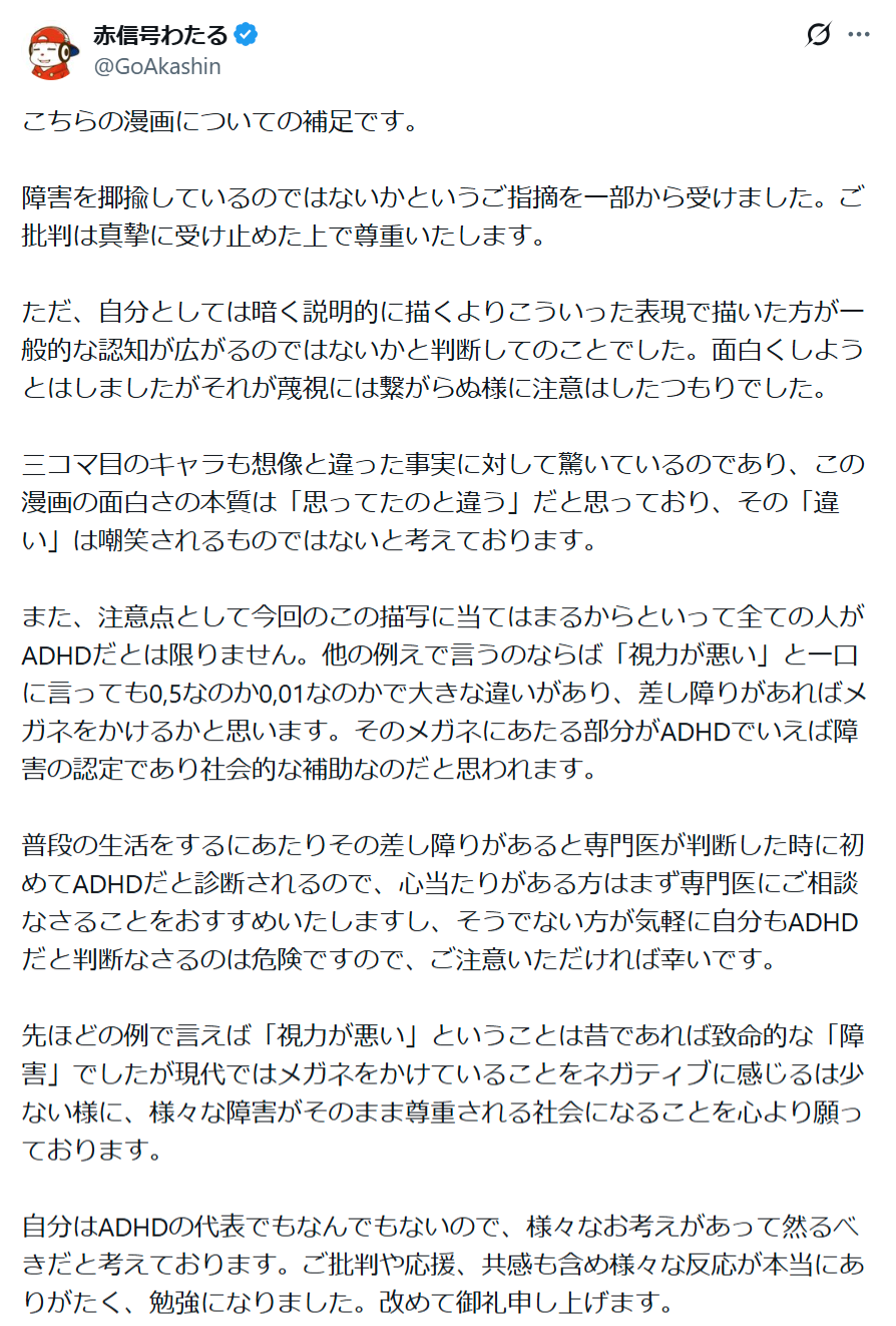 【悲報】ADHDをネタにして炎上した漫画家、お気持ち表明wwwww