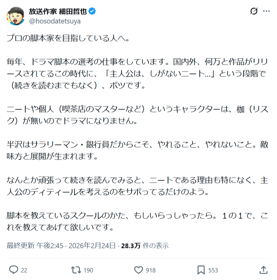 【悲報】全国の脚本家志望、主人公を「ニート」にしてしまい秒で落とされる