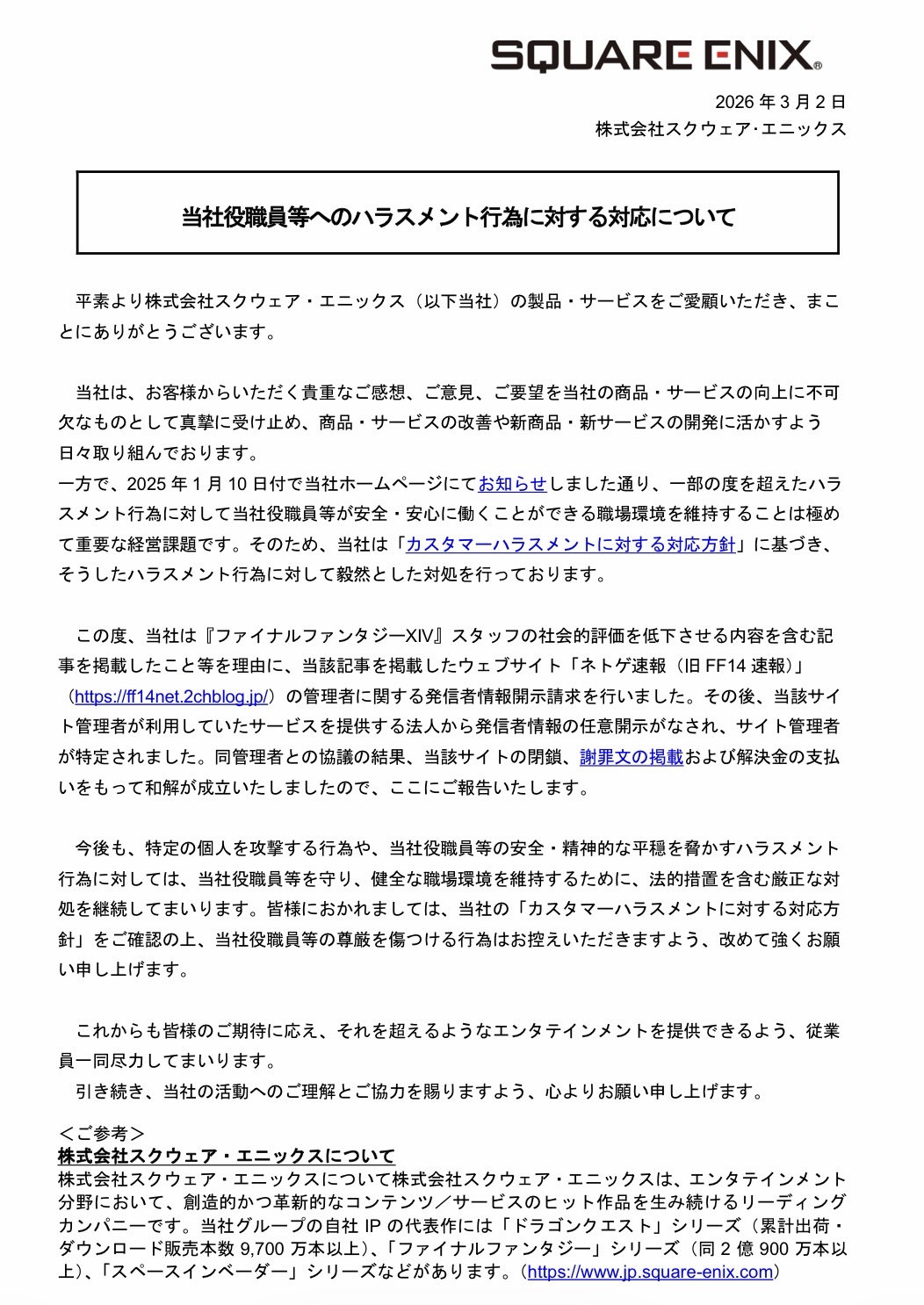 【悲報】スクエニ、FF14スタッフへの「ハラスメント行為」に徹底対応するwwww
