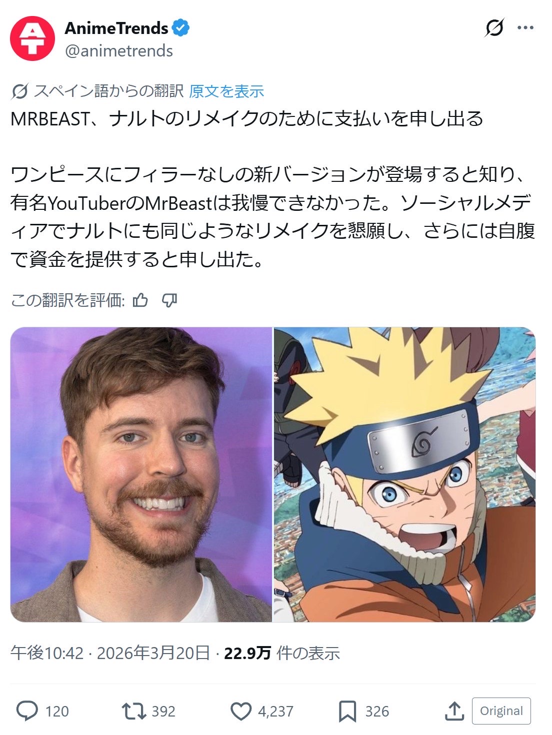 【朗報】世界一のYouTuber「NARUTOアニメを1話からリメイクしてくれ!金なら俺が出す!」