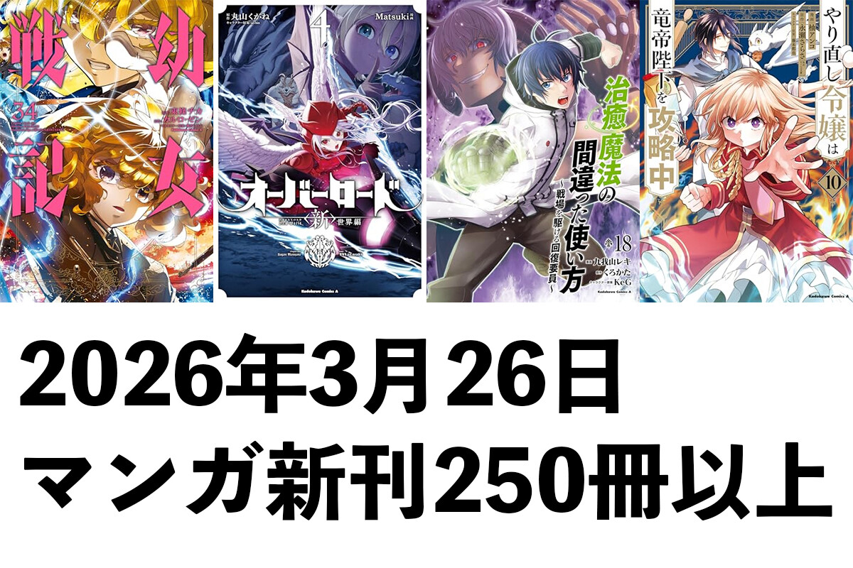 【3/26発売】マンガ新刊:「幼女戦記 34」「オーバーロード<新>世界編 4」「治癒魔法の間違った使い方 18」「やり直し令嬢は竜帝陛下を攻略中 10」など250冊以上