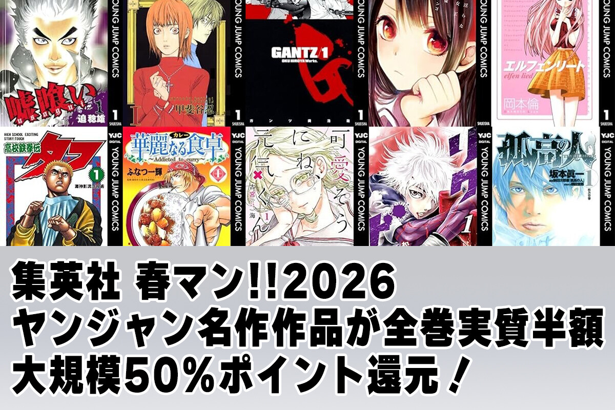 5日まで!「嘘喰い」「LIAR GAME」「GANTZ」全巻実質半額!Kindleでヤングジャンプコミックス大規模50%還元 「エルフェンリート」「高校鉄拳伝タフ」「孤高の人」など【集英社 春マン!!】