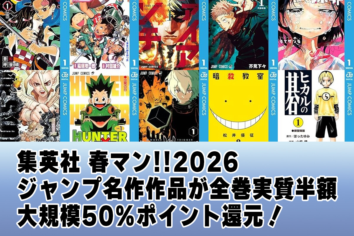 5日まで!鬼滅に呪術が全巻半額相当!Kindleでジャンプコミックス大規模50%還元 「Dr.STONE」「HUNTER×HUNTER」なども【集英社 春マン!!】