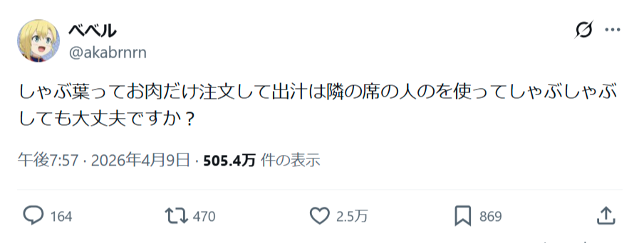 【悲報】アニメアイコン「しゃぶ葉ってお肉だけ注文して出汁は隣の席の人のを使ってしゃぶしゃぶしても大丈夫ですか?」→2.5万いいね