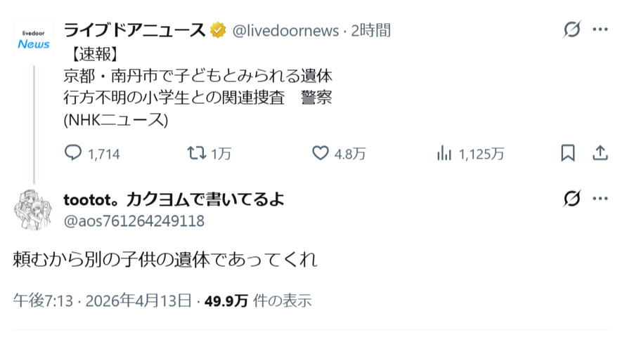 【悲報】カクヨム作家「頼むから別の子供の遺体であってくれ」→批判殺到wwww