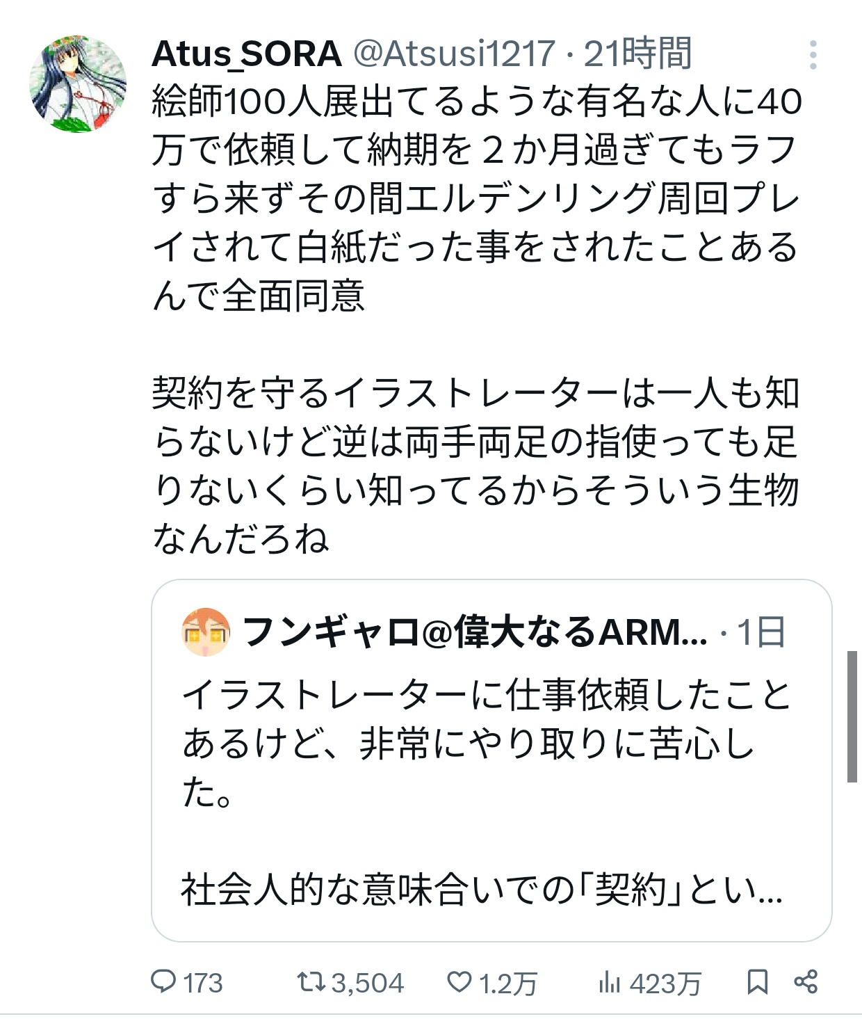 【悲報】客「40万で描いてください!」有名絵師「いいですよ」→客「納期過ぎたけどどうなってます?」絵師「エルデン周回中です」