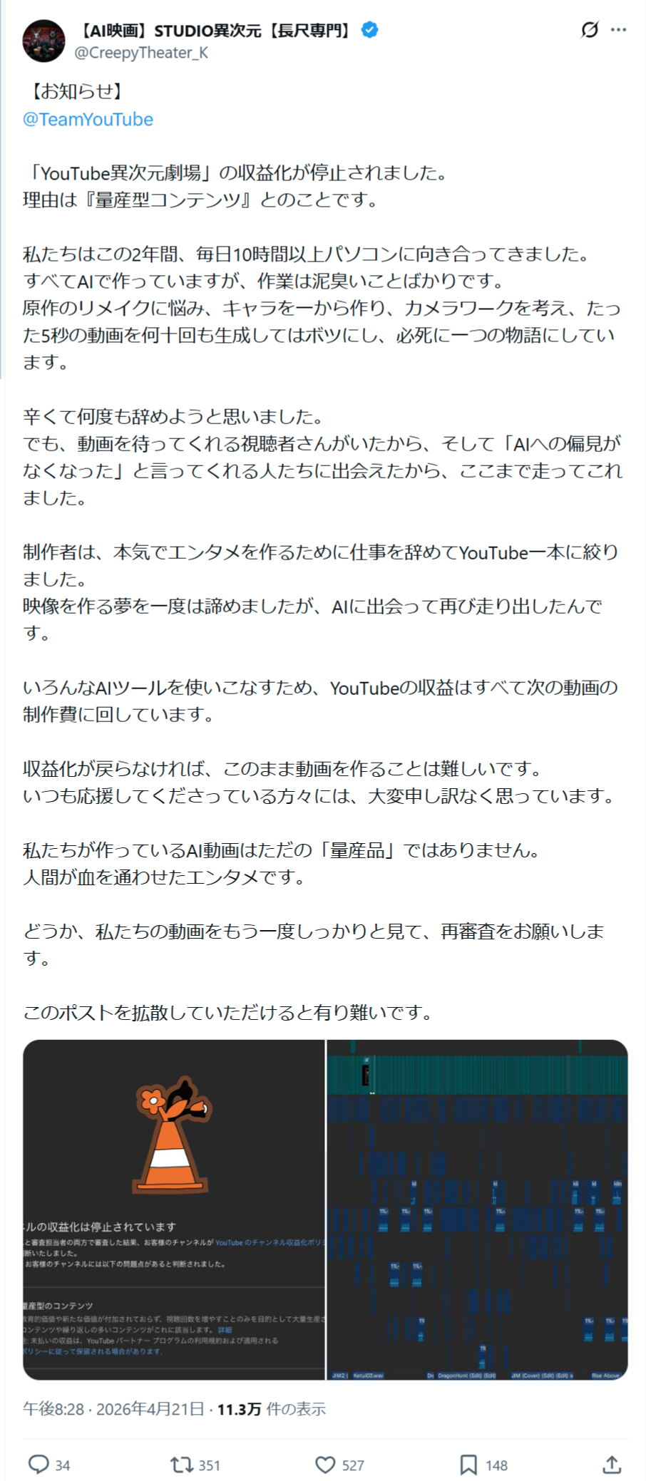 【悲報】AI映画系YouTuber、収益化停止されてお気持ち表明wwwww