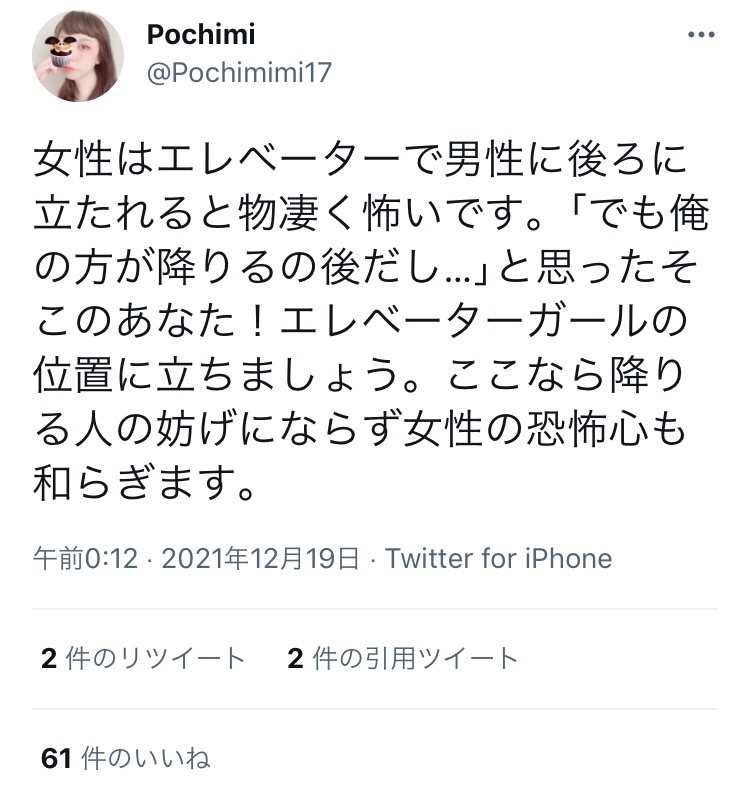 【画像】女子「エレベーターで背後に立つ陰キャ、怖いからやめろ」