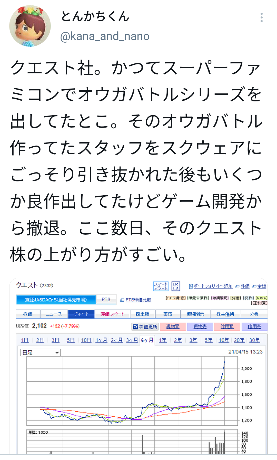 【画像】ツイ民「オウガバトルのクエスト社株価爆上げ」元社員「違います」ツイ民「違わない」