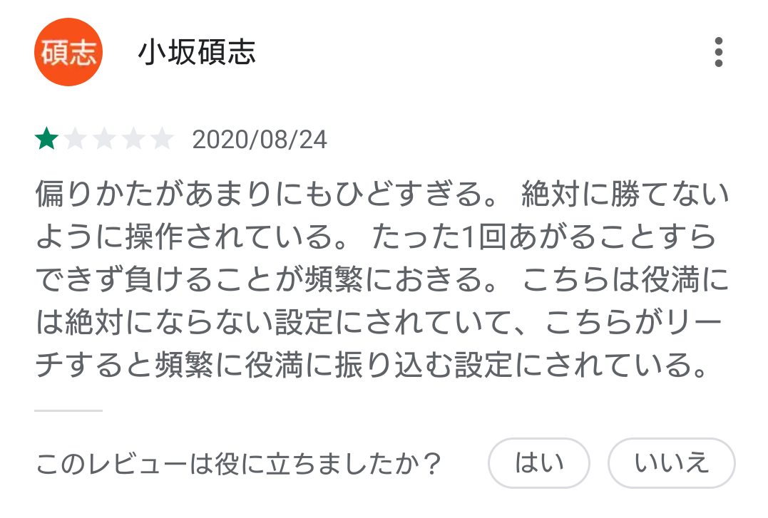 【画像】麻雀アプリ民さん、レビューで発狂してしまうwww