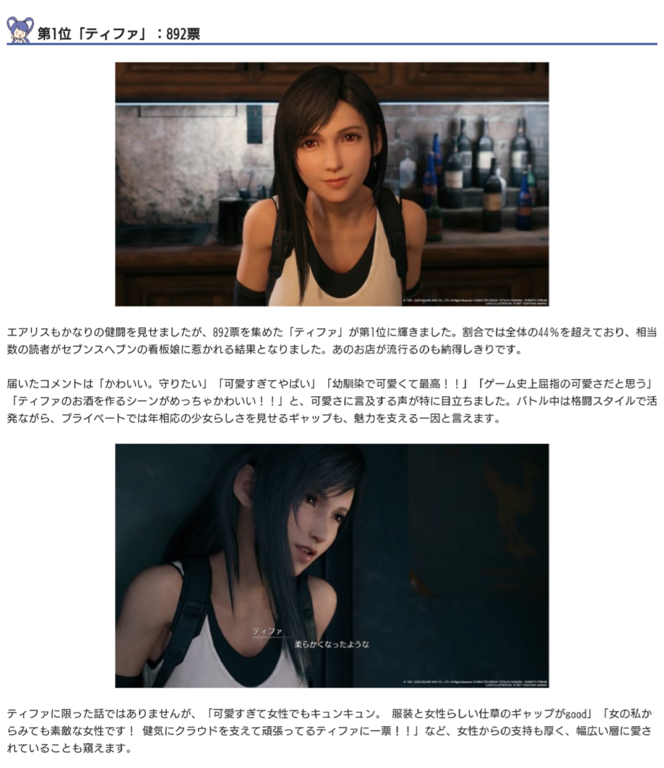 【画像】FF7のティファ、主人公やエアリスを差し置いて人気投票一位を獲得へwwww