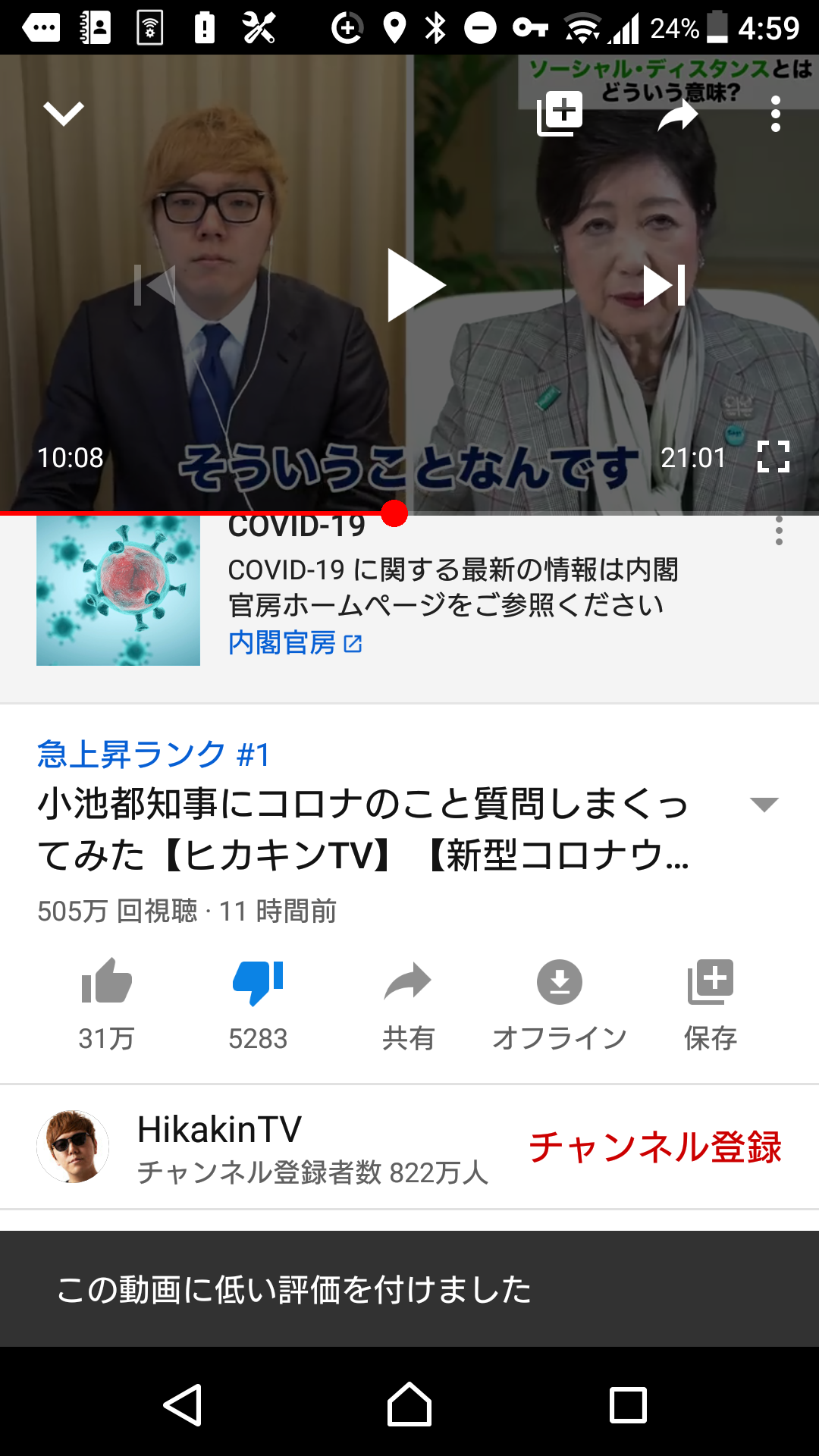 【新型コロナ】ヒカキンと小池都知事のYouTube対談動画、わずか半日で500万再生越えwww