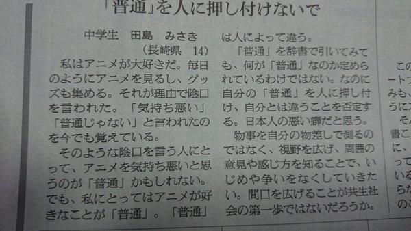 【画像】JC(14)の投書 「アニメ嫌いの人に一言。あなたの「普通」 押し付けないで」