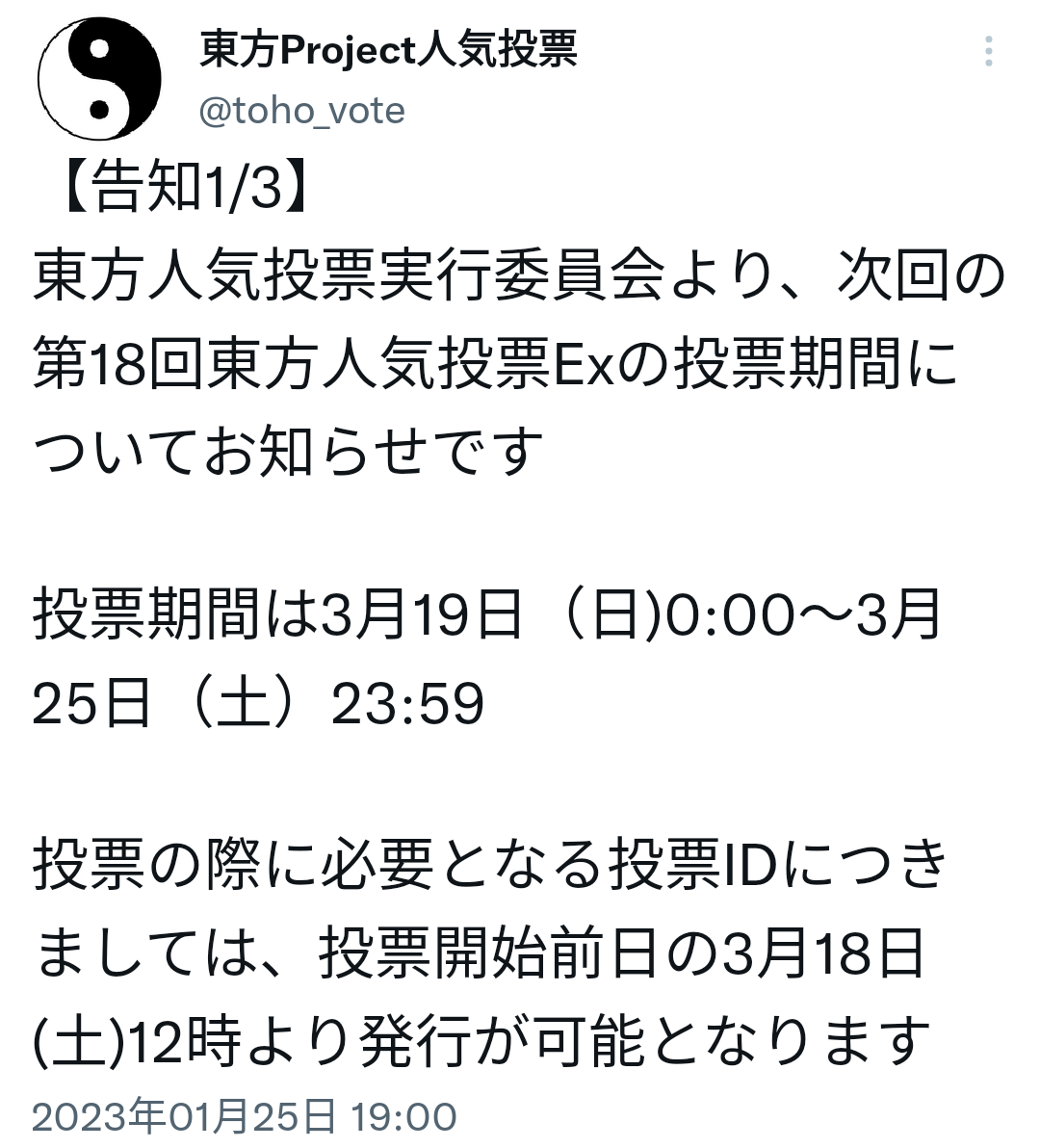 第18回東方人気投票Ex 3月19日(日)0:00〜スタート!