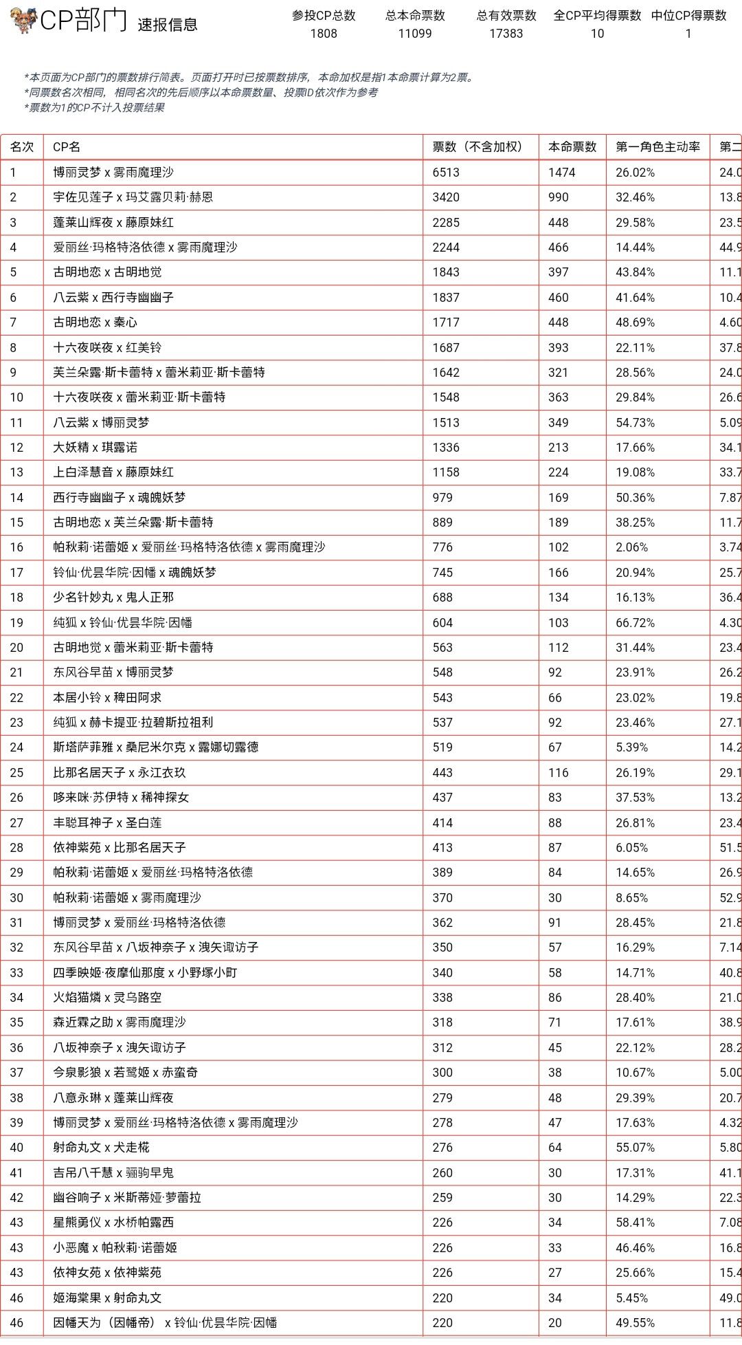 中国の東方人気投票結果