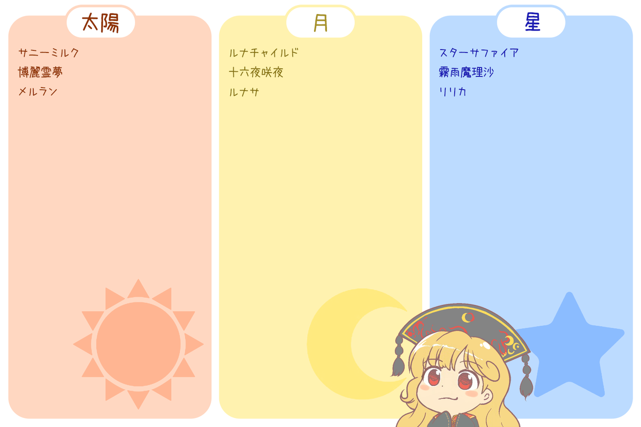 東方キャラを太陽・月・星で区分したら誰がどれに当てはまるかしら?