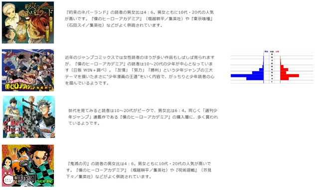 主に男人気のジャンプ漫画→ヒロアカ、ブラクロ、石、僕勉 半分以上が女人気の漫画→