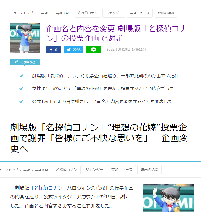 【悲報】名探偵コナン「理想の花嫁を選んでね」→「時代遅れ!キャラが花嫁衣装着てる!」企画中止&謝罪へ