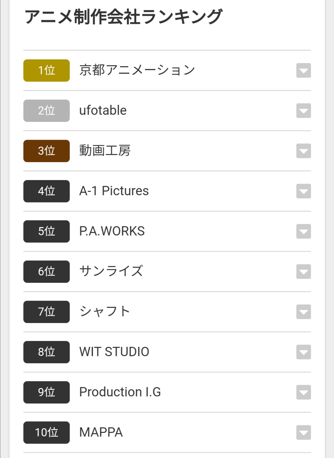 【画像】最新のアニメ制作会社ランキングが発表されるwwwww