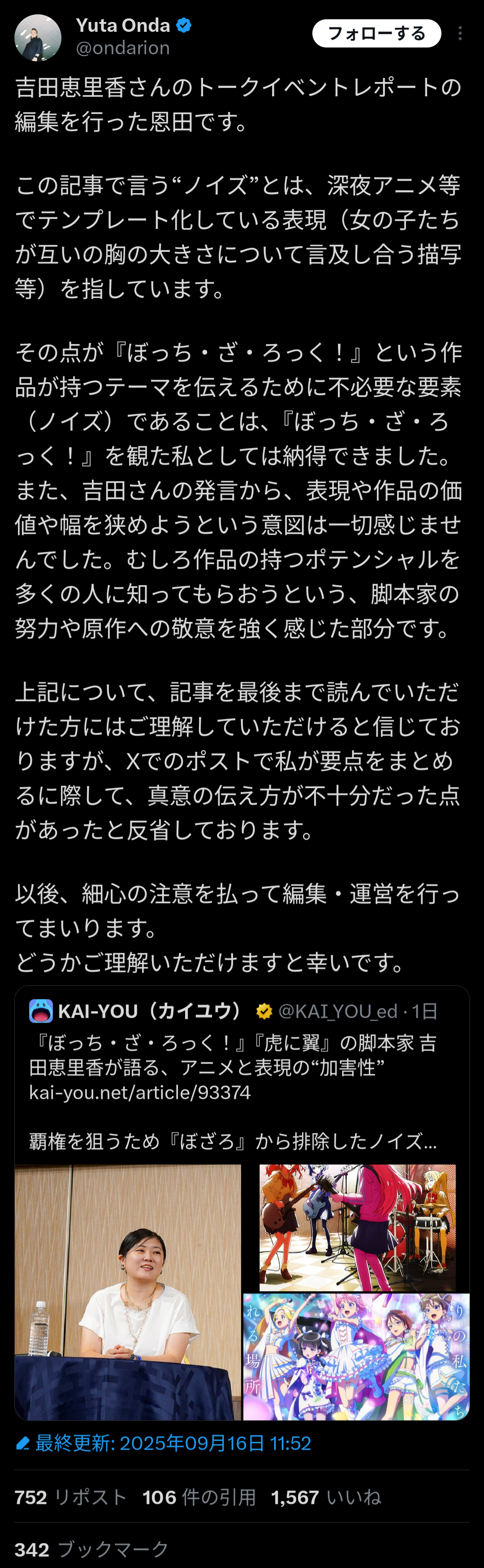 【正論】ぼざろ脚本家のニュースを書いたライター「最後まで記事を読んでるならあのノイズ発言は正しいと理解できます」