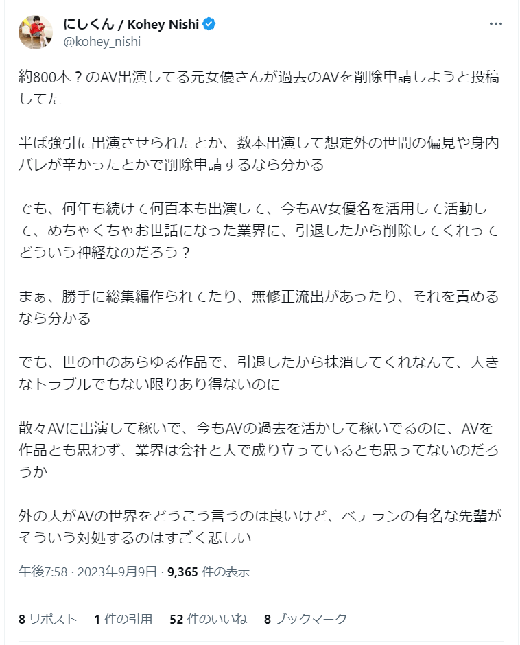 【悲報】セクシービデオ監督「800本も出演してる元女優さんが削除申請。強制被害や騙されたのなら分かるが…」