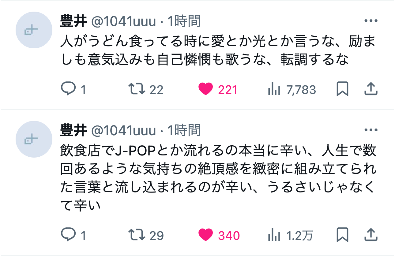 【悲報】X民「飲食店でJ-POP流れるの本当に辛い。人がうどん食ってる時に愛とか光とか歌うな。転調するな」