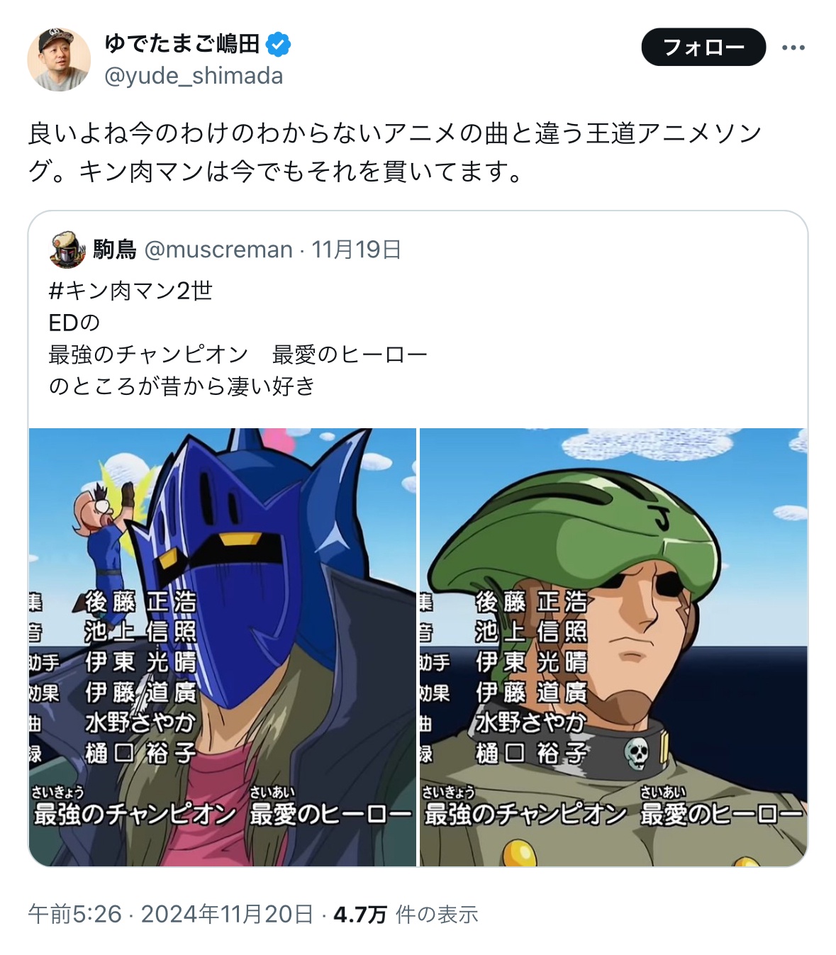 【悲報】キン肉マン作者、また炎上 「最近のワケわかんねぇアニソンと違ってキン肉マンは王道!」