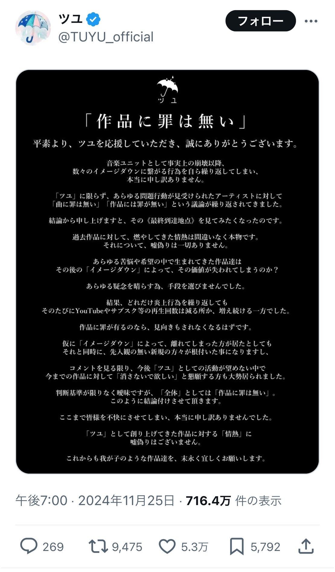 【悲報】メンバーが10代女を刺して逮捕されたボカロ音楽ユニット『ツユ』「逮捕されたけど楽曲に罪はない」→批判殺到→「わかった、全楽曲消すわ」 楽曲に罪はあるのかないのか物議に