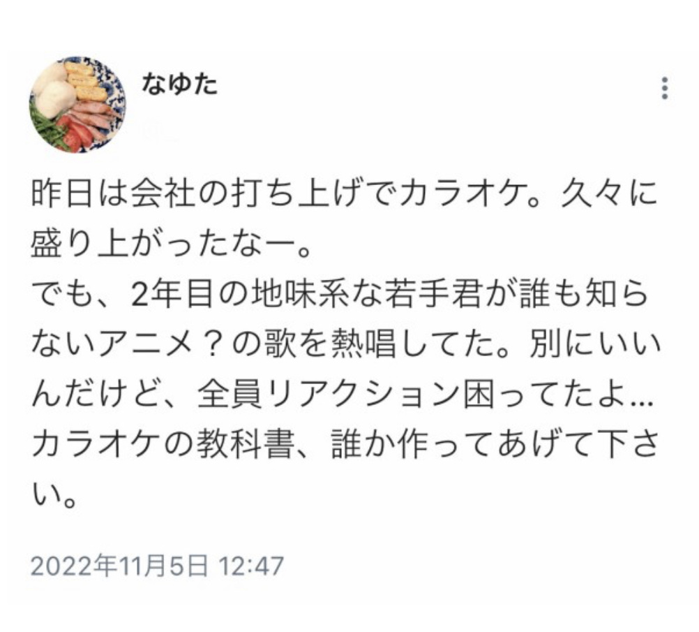 【悲報】女さん「会社の打ち上げで地味なオタクがアニソン歌ってたw」