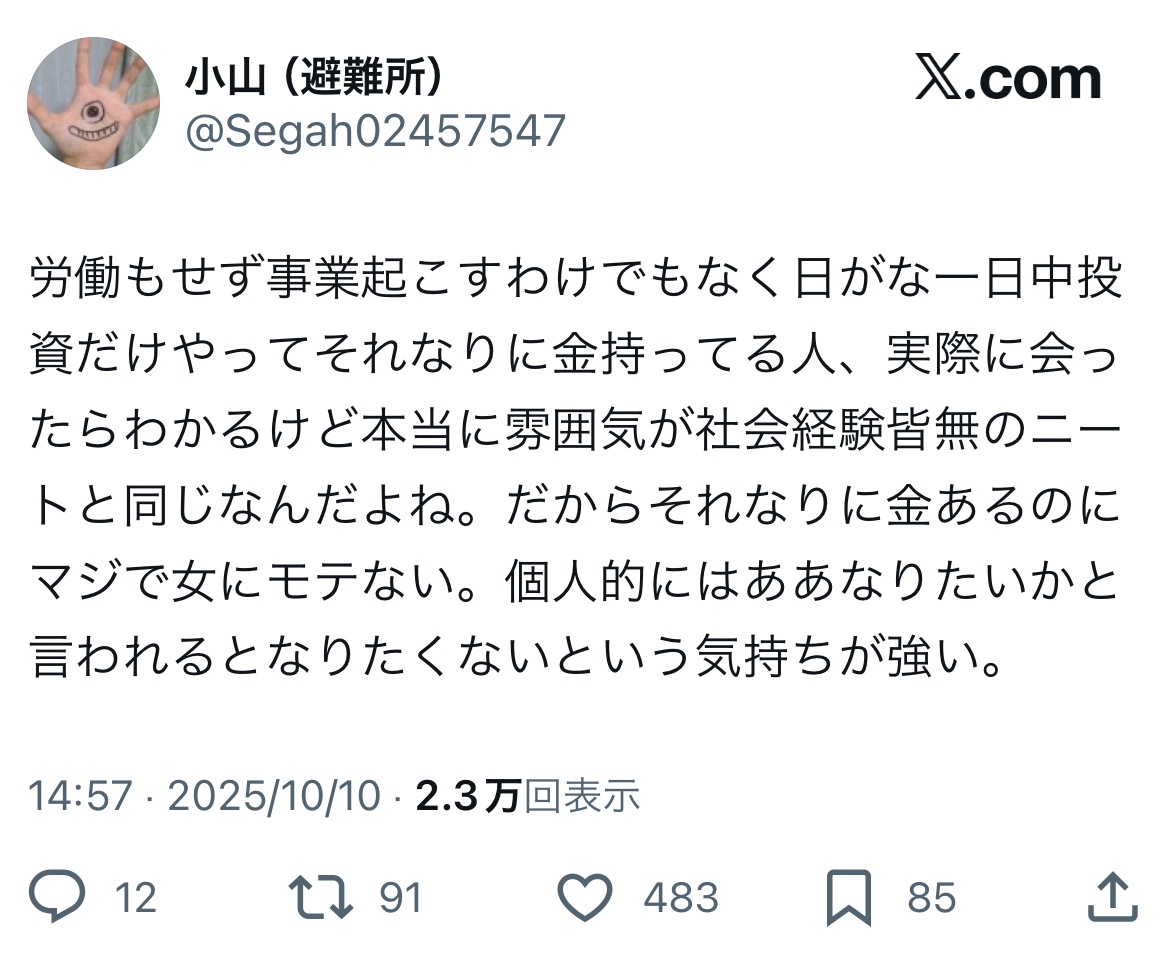 【悲報】識者「一日中投資だけやってそれなりに金あるやつ、マジで女にモテない。雰囲気がニートと同じ」←マジ?