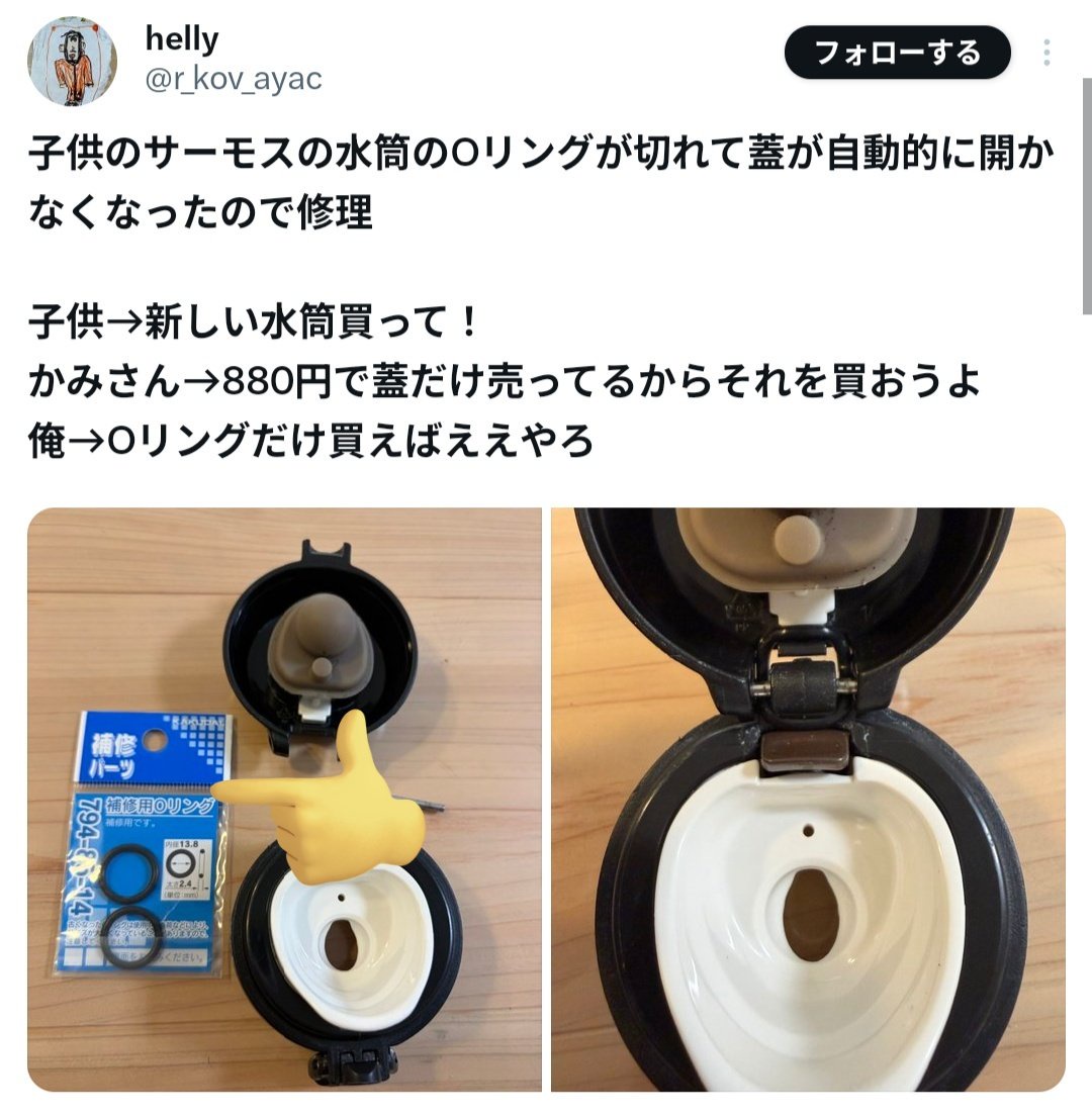 【悲報】節約系パパ「水筒が壊れた?Oリングだけ買えばええやろ」→非食品用を買って叩かれるwwww