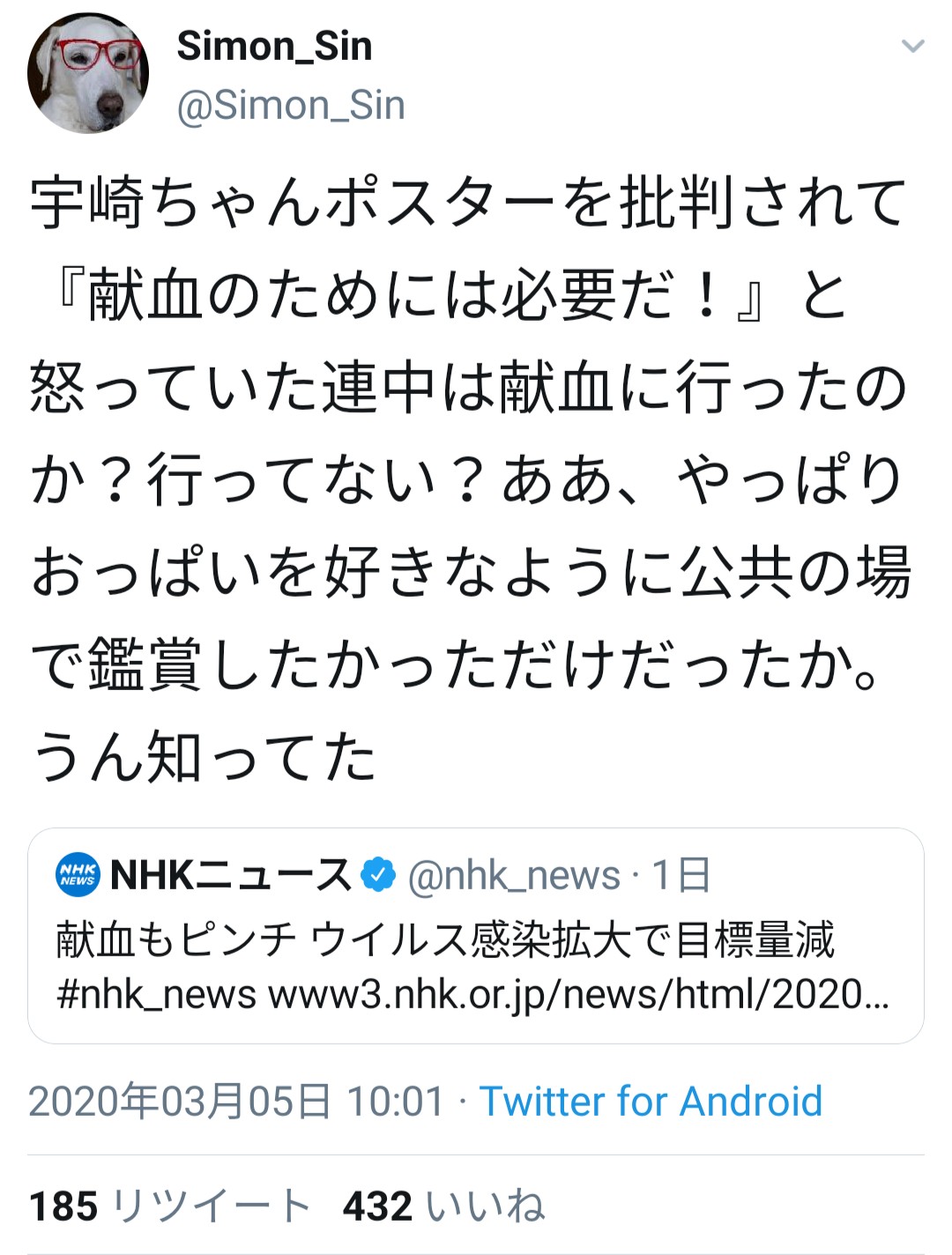 【悲報】宇崎ポスター界隈のツイフェミ、おかしくなる「コロナの影響で献血が減った?せやッ!」