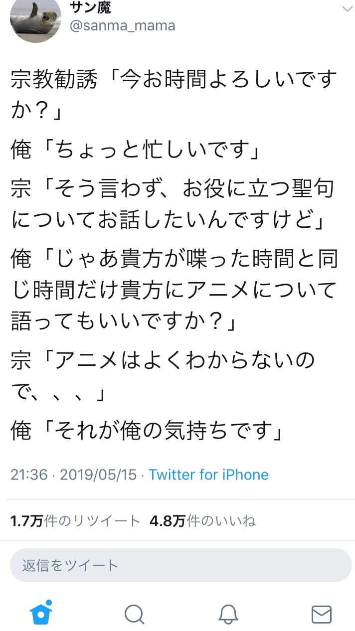 【5万いいね】宗教勧誘者「話聞いて」オタク「同じ時間アニメの話ししていい?」宗教「興味ない」オタク「それが俺の気持ち」